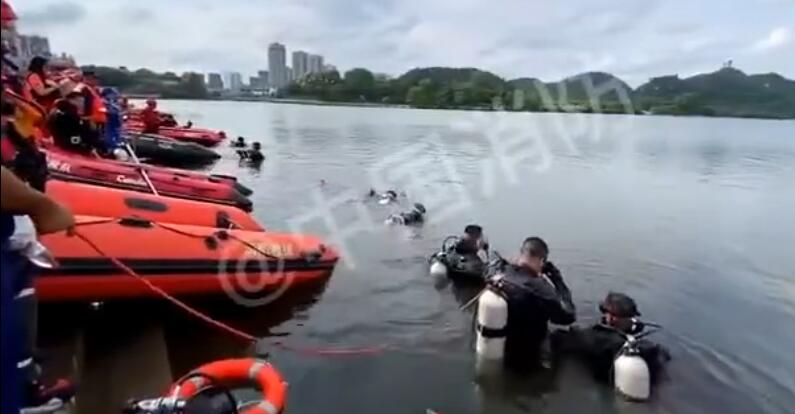 贵州公交车坠湖现场 潜水员一字排开进行地毯式搜救