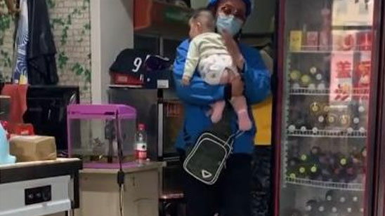 太暖了!餐馆老板在厨房忙活 外卖小哥帮照看孩子