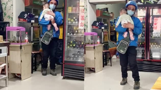 外卖小哥餐馆等餐 轻手轻脚帮老板抱孩子 发现镜头一把挡住小屁屁