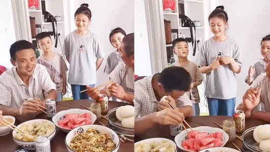 姐弟跳手语舞为爸爸庆生 爸爸淡定啃馒头夹菜 手上的筷子却暴露了