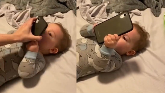萌娃自嗨模式开启! 对着手机咿咿呀呀 接听第一通电话表情萌翻了