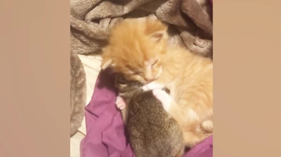 可爱!小奶猫紧紧抱着怀里的小兔子不撒手 网友:心都萌化了!