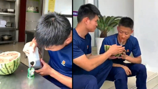 调皮消防小哥做了一份特调“西瓜汁” 班长刚喝第一口后表情亮了