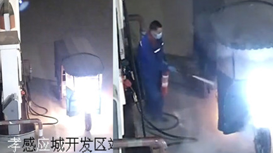 25秒!加油站内摩托车突起火 工作人员神反应将火扑灭