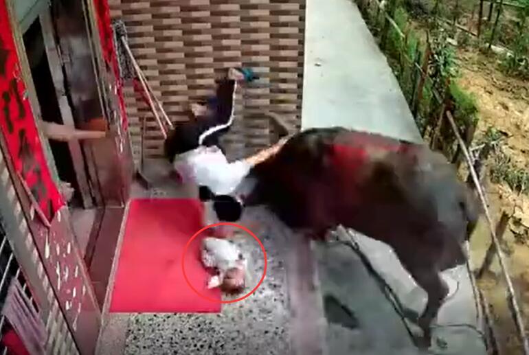广东一抱娃妇女在家门口被疯牛撞翻