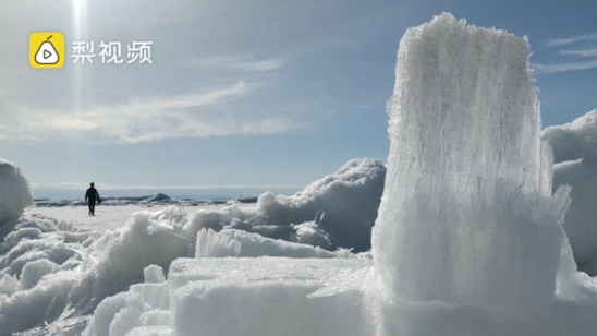 震撼!新疆乌伦古湖出现风积冰山奇观 层层叠加绵延数十公里