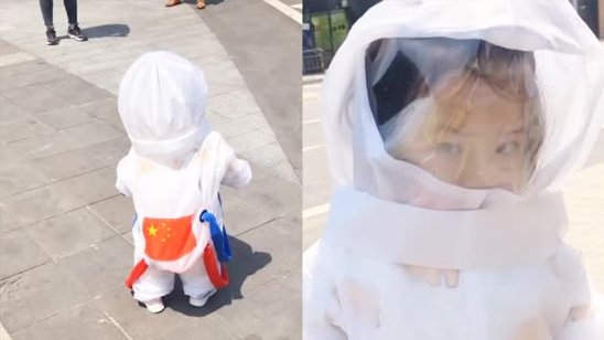 可爱!武汉宝宝77天首次出门 穿宇航防护服被围观 站在原地一脸懵圈
