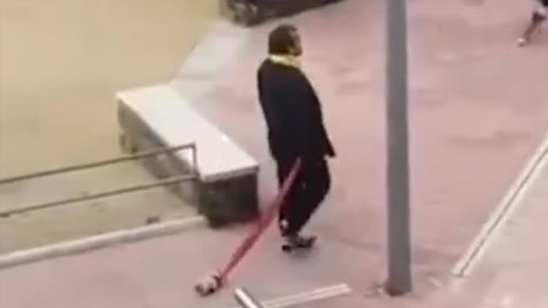 西班牙限行首日狗狗成“通行证” 民众为了出门街上溜玩具狗