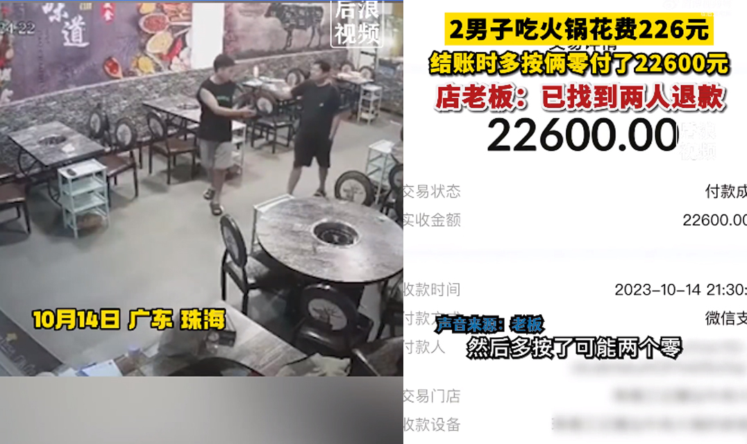 视频 | 2名男子吃火锅花226元付了22600元 老板:多按了俩零,已找到人