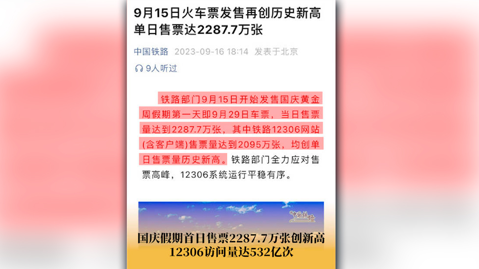 视频 | 国铁集团:2023年国庆假期首日售票2287.7万张创新高
