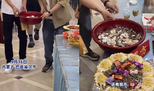 视频 | 2名男子抬1盆2000元硬币给好友随礼:有30多斤重