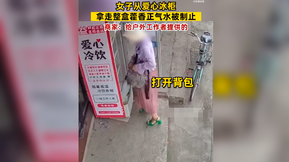 视频 | 女子拿爱心冰柜整盒藿香正气水被制止 商家:全拿走环卫工人没得用了