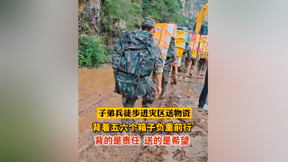 视频 | 战士徒步数十里赴洪涝灾区送物资 每人身背五六个箱子