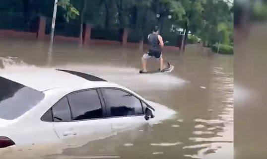 视频 | 暴雨后道路积水男子冲浪上班 当事人:水深1.2m,自己是专业人士