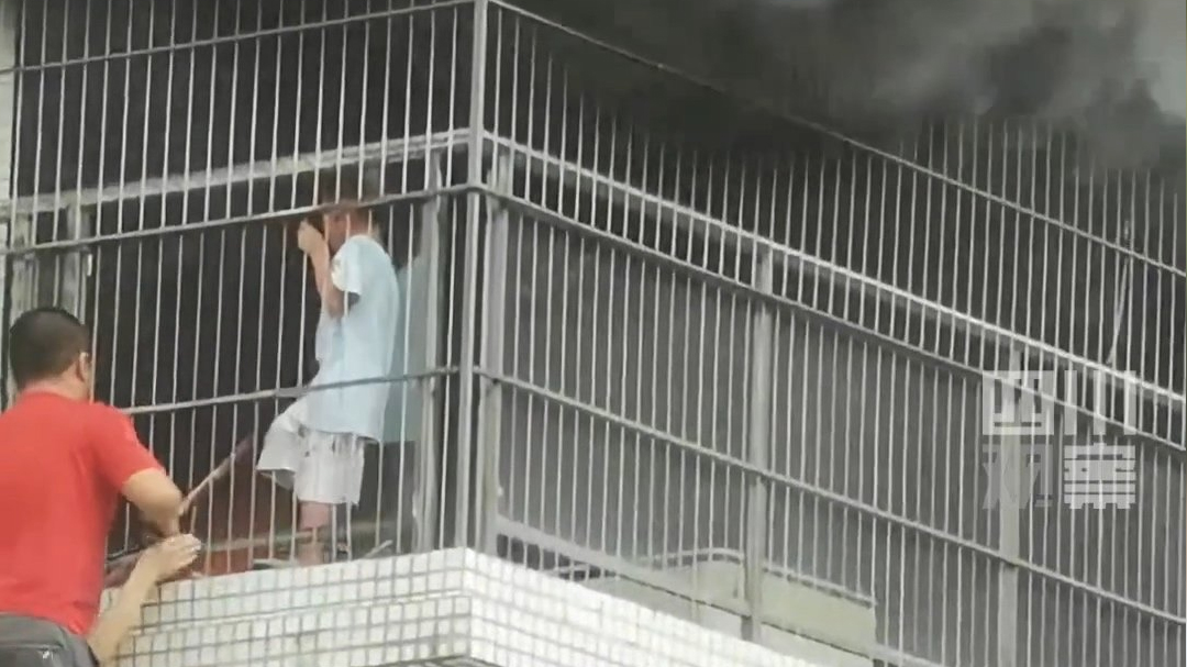 男孩被困火场 红衣大哥爬楼拆窗救人