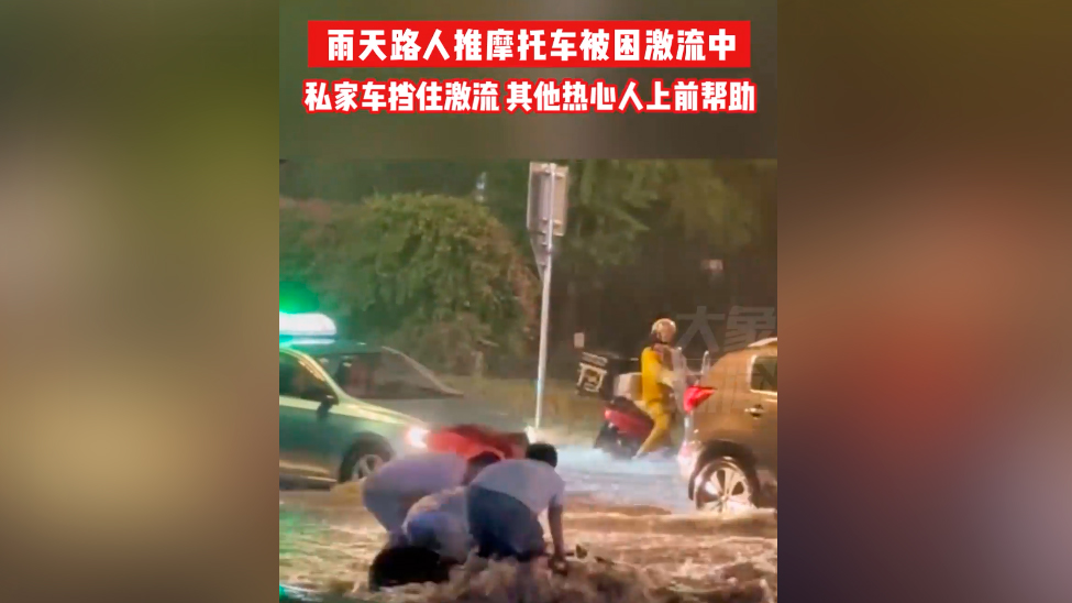 视频 | 雨天路人推摩托车被困激流中 私家车为其挡住激流