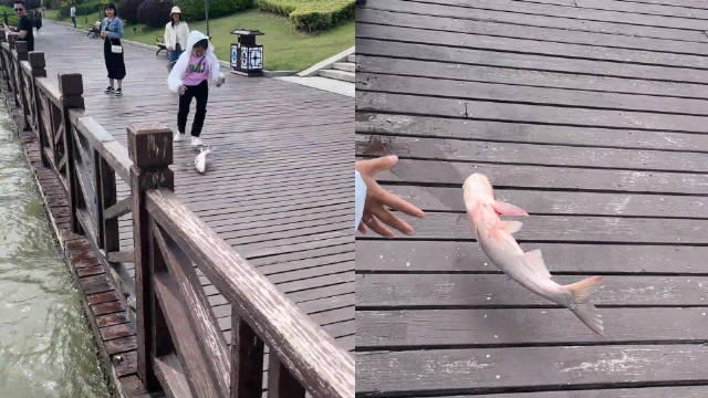 视频 | 男子逛景区偶遇10多斤大鱼跳上岸 开心把鱼带回家