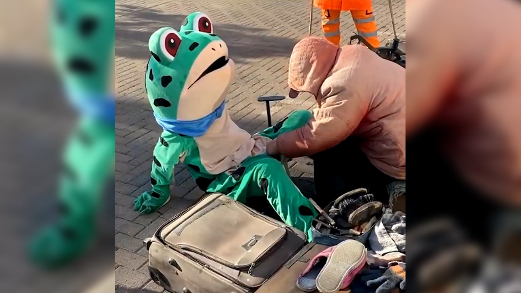 视频 | 青蛙人偶裤裆开裂坐地让阿姨缝好:还好戴了头套