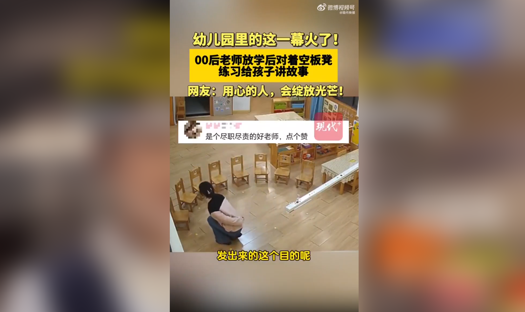 00后幼教对着空板凳练习讲故事 用心放光芒此刻具象化了