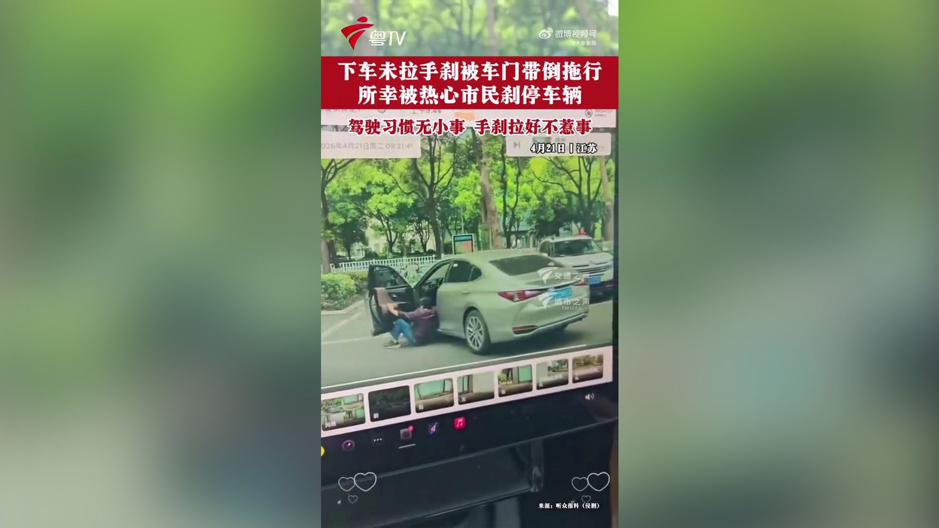 揪心!女子忘拉手刹遭车卡拖行,大哥飞身救人