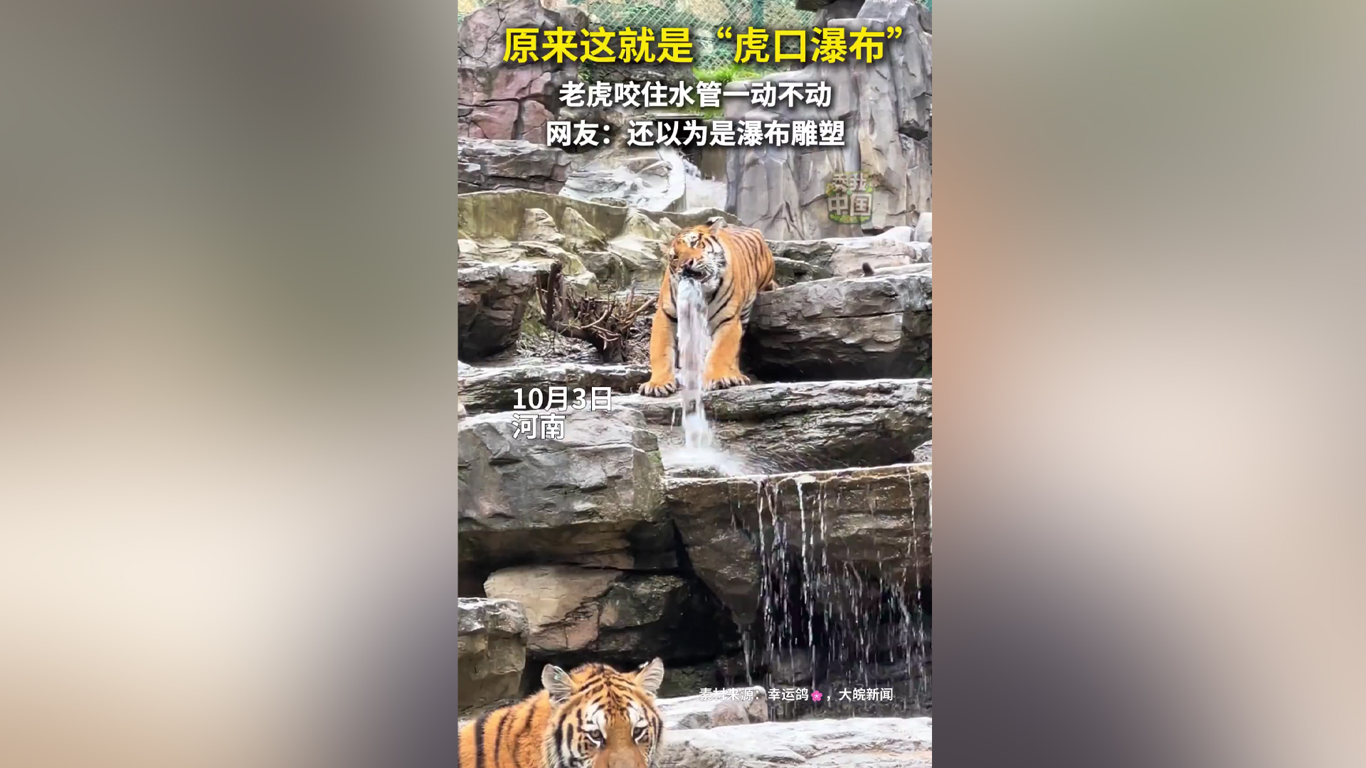 动物园老虎咬水管即兴表演“虎口瀑布”