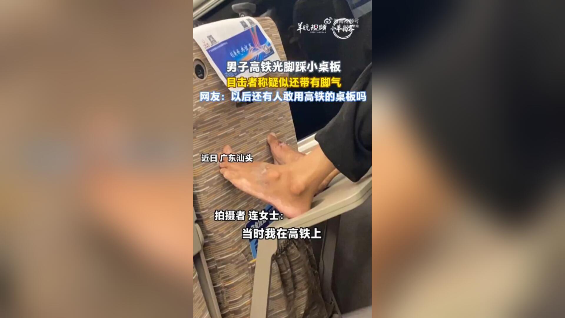 男子高铁上光脚踩小桌板 目击者称疑似还有脚气