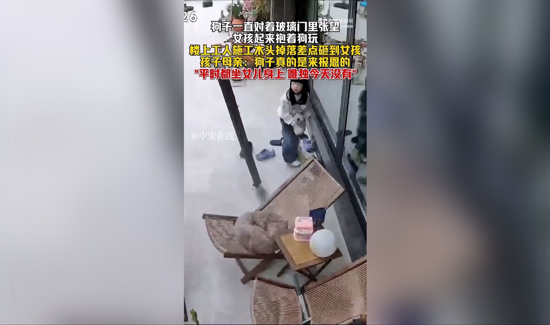 女孩起身抱狗躲过天降木头