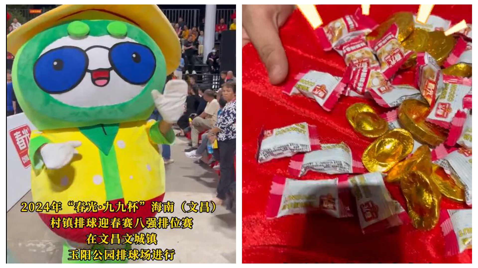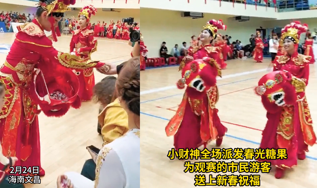 海南“村VA”迎春赛丨小财神全场派发春光糖果,为观赛的市民游客送上新春祝福