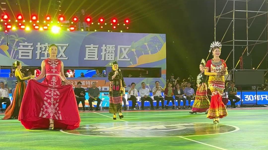 视频 | 海南东方“村BA”总决赛开场表演,模特们身穿黎族服饰,手拿东方特色农产品带来了一场民族风走秀