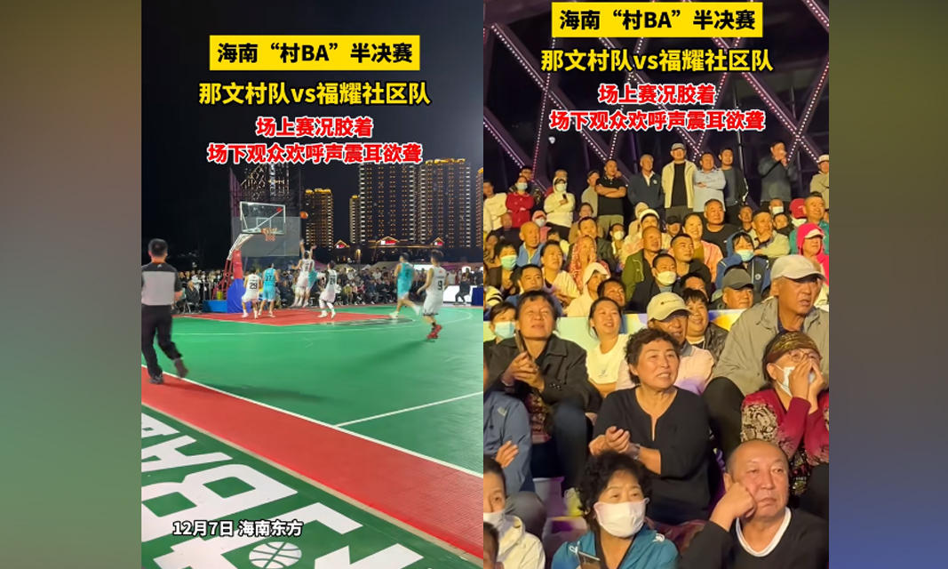 海南“村BA”半决赛,那文村队vs福耀社区队,场上赛况胶着,场下观众欢呼声震耳欲聋
