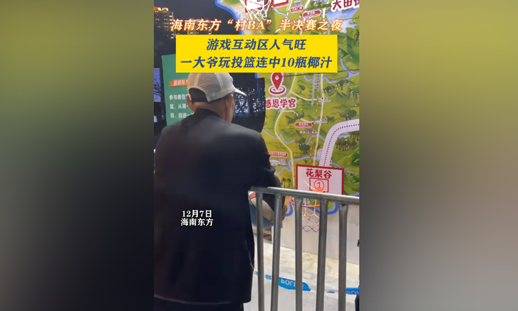 海南东方“村BA”半决赛之夜,游戏互动区人气旺,一大爷玩投篮连中10瓶椰汁