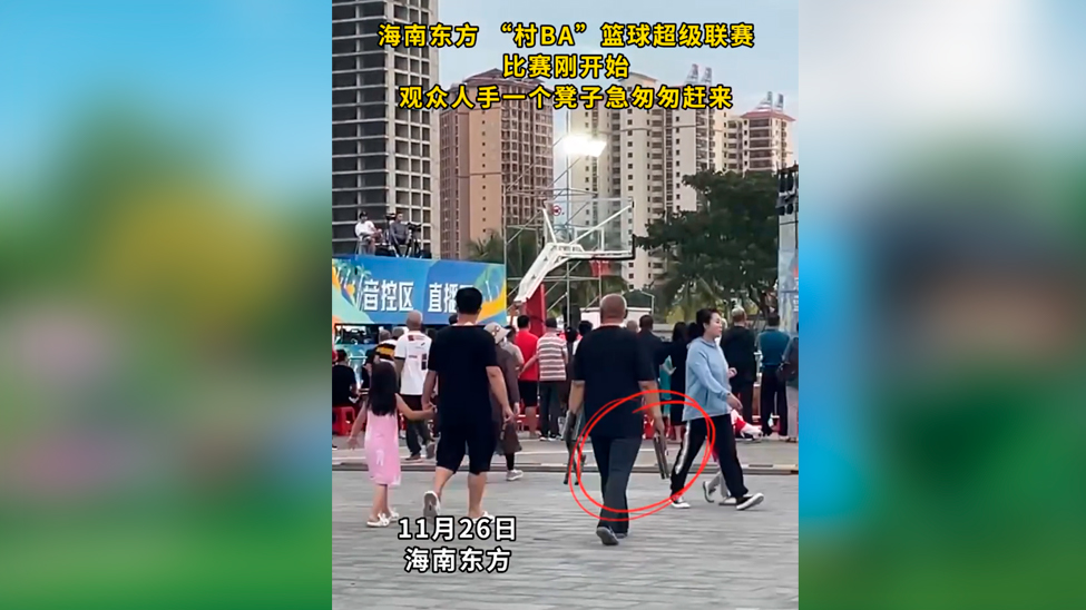 海南东方“村BA” 开赛前,市民观众拿凳子进场占座