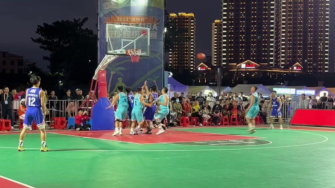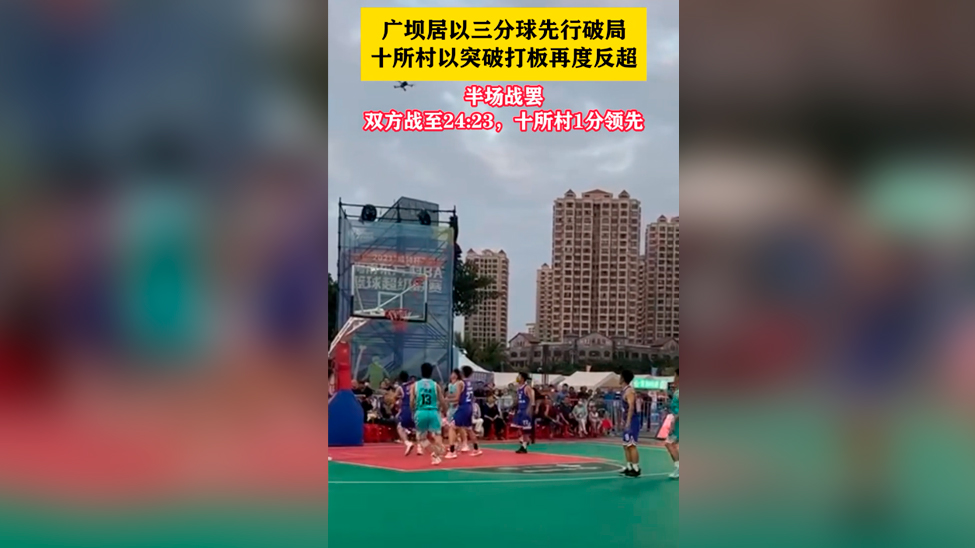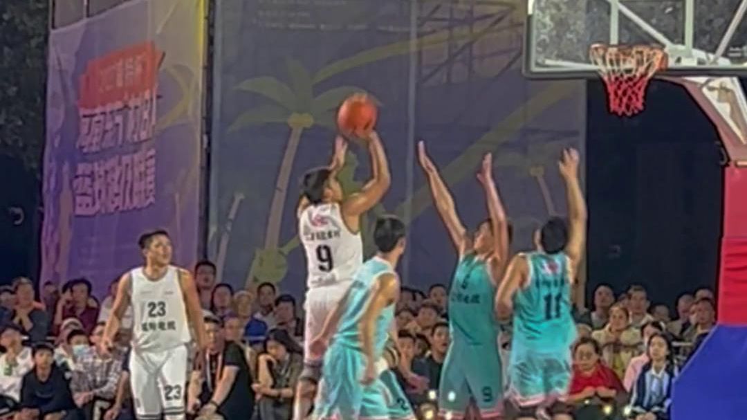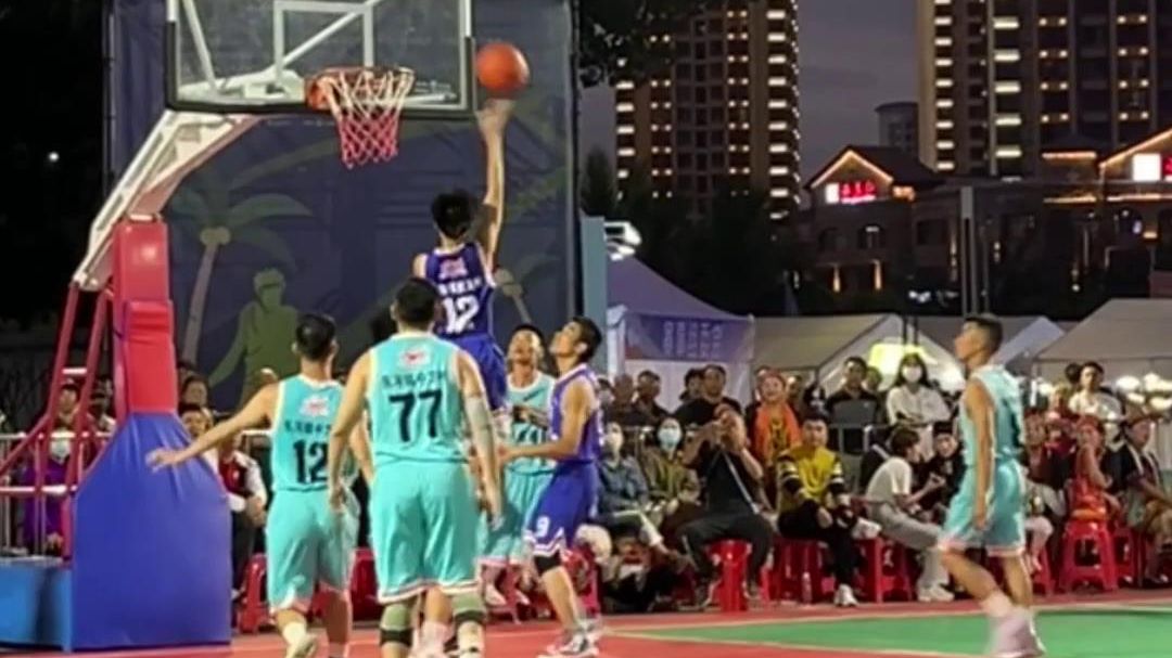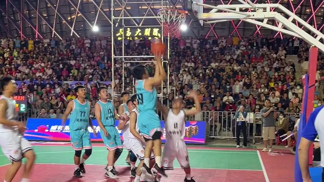 海南东方“村BA”第五比赛日第三场,江边村队内线传导命中两分,那文村队回敬45度角三分