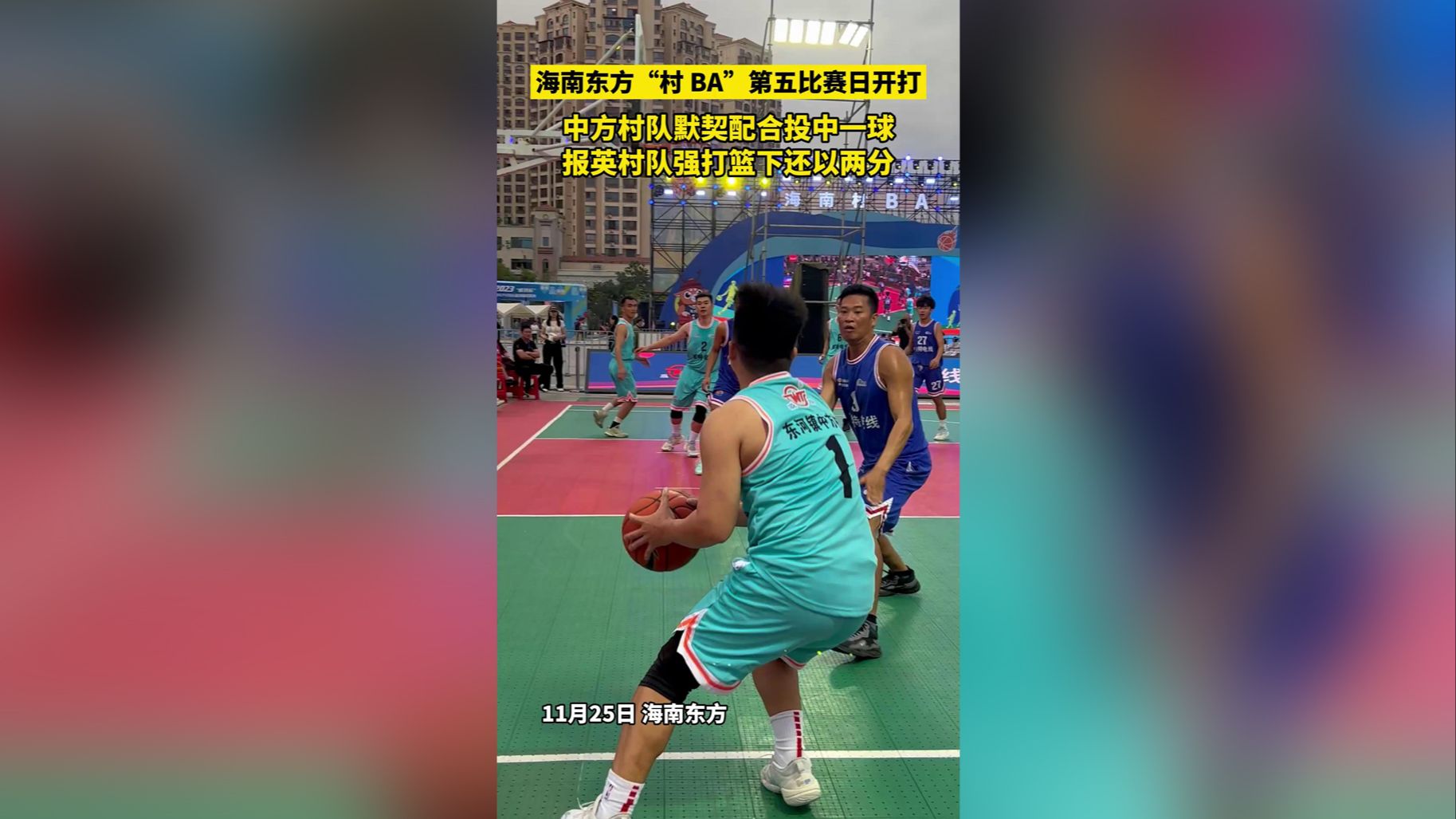 海南东方“村 BA”第五比赛日开打,中方村队默契配合投中一球,报英村队强打篮下还以两分