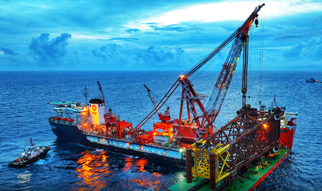 见摄自贸港·一线直击|劈波斩浪立“神针”——我国海上首个超高温高压气田导管架安装就位