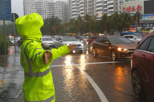 实拍:“卡努”来袭 海口街头暴雨 交警冒雨疏导交通