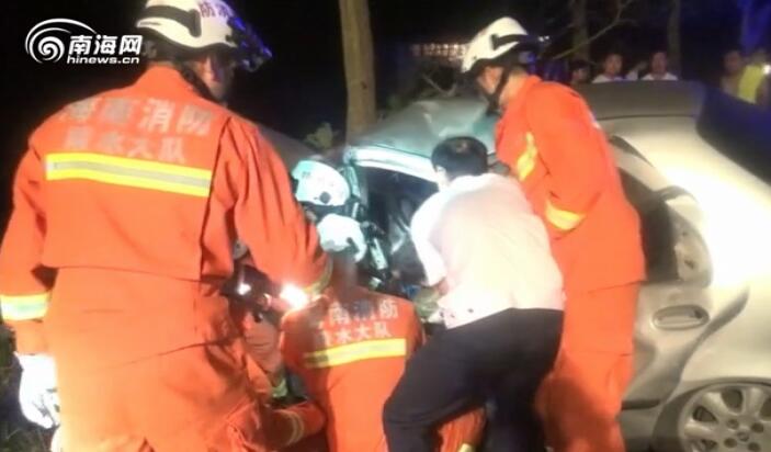 陵水:大巴车与小轿车相撞1人被困 消防官兵破拆救援