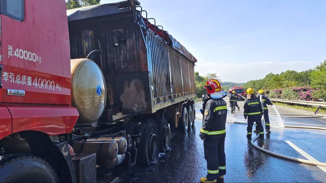 椰视频 | 惊险!一半挂车高速路轮胎起火,昌江消防紧急处置