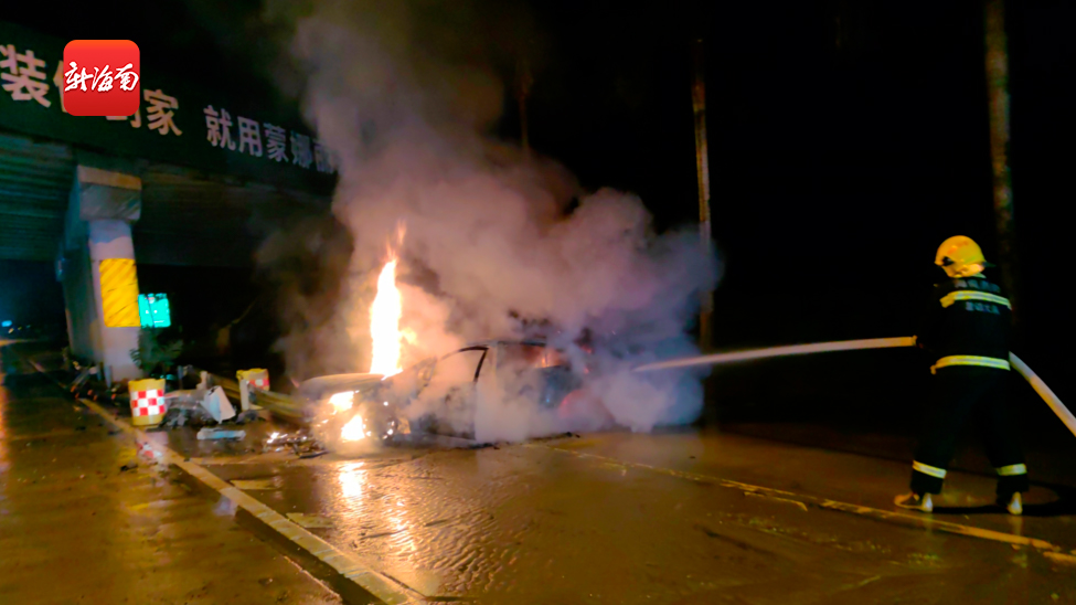 椰视频 | 澄迈一轿车撞上护栏后起火 消防救援人员出警处置火情