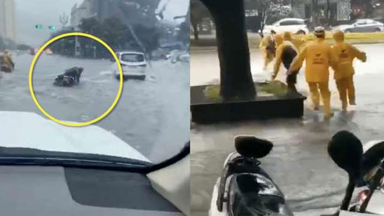 心酸一幕!强降雨致道路积水成河 外卖员摔倒仍紧握客户餐食