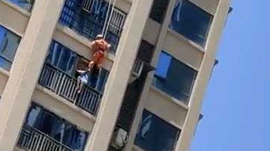 女子17楼阳台欲轻生 消防员从天而降飞蹬解救