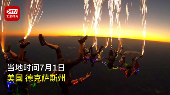 美国跳伞者脚绑烟花从1万英尺高空跳伞 夜空瞬间被点亮