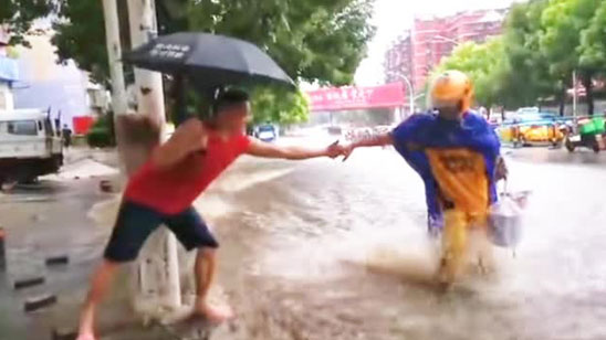 湖北宜昌突遭特大暴雨 外卖员急流逆行被困水中 路人果断伸手救助