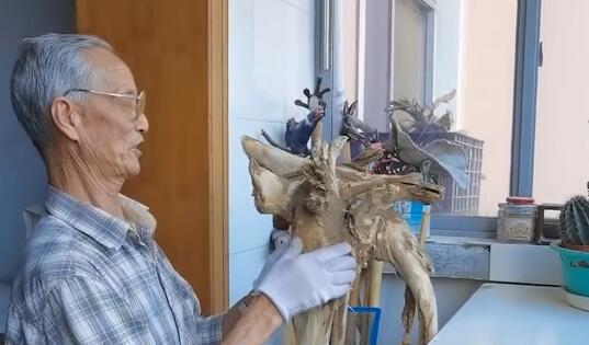 七旬爷爷废树根上刻故事:10年做出70多件根雕拐杖