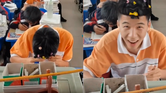 男生偷戴同桌的小雏菊发卡 低头专心梳妆打扮 一抬头脸上表情亮了