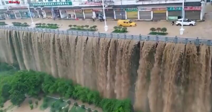 贵州沿河暴雨导致城区内涝 街道现“瀑布”景象