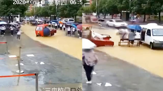 暖哭!学校门口积水成河 家长开车接力搭桥渡学生 事后悄悄离去