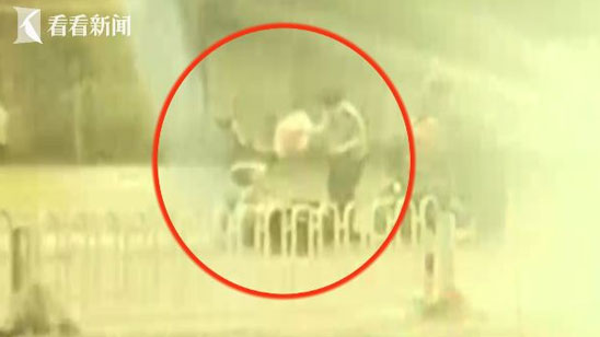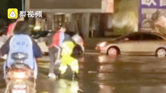 大雨中骑车人带孩子滑倒 交警救人时他也出手了