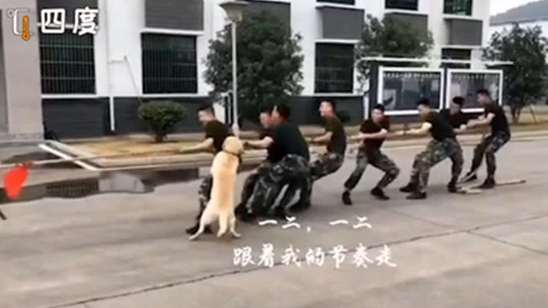 武警战士拔河比赛 狗狗扑战士身上借力使力拔河:没我你们赢不了