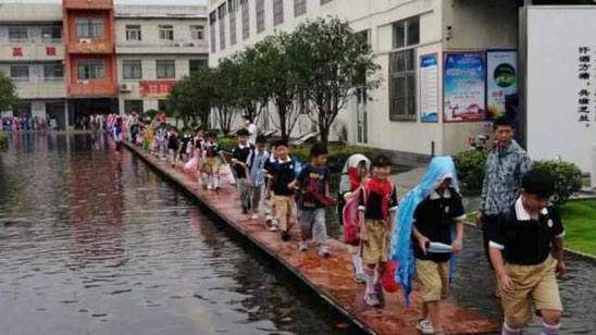 暴雨过后学校积水成河 老师铺80米木桥护送学生回家